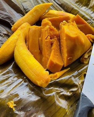 Die Mischung portionsweise in Bananenblätter geben und gut verschließen.