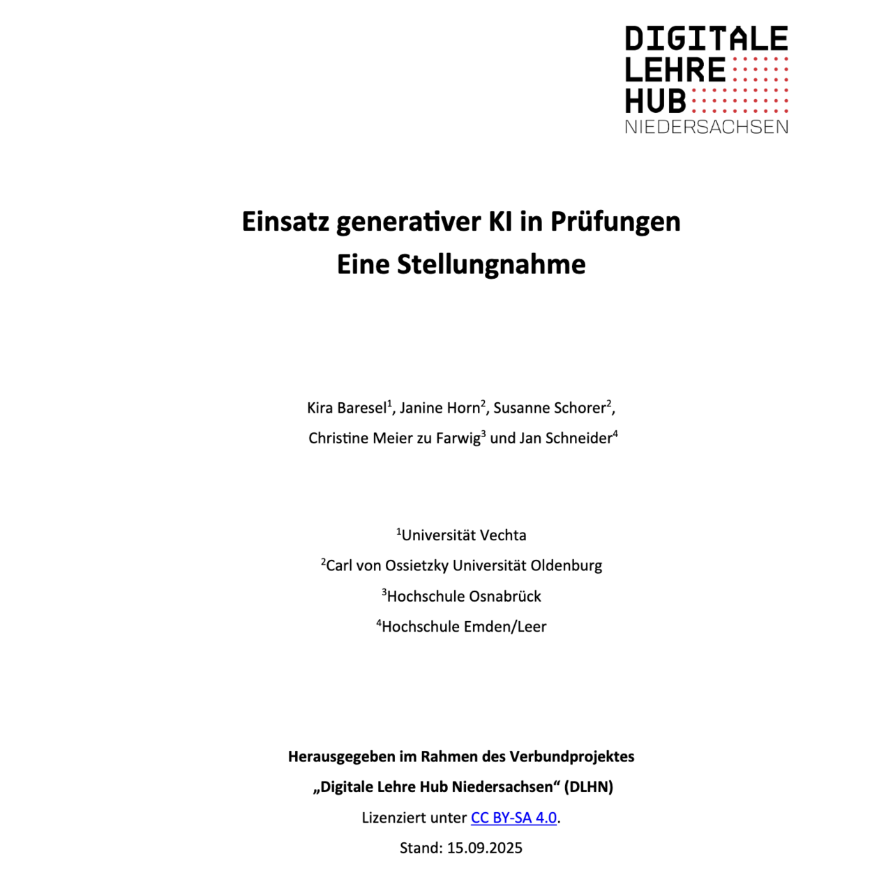 DLHN-Projektseite "KI in Studium, Lehre und Prüfungen"Hier finden sich Informationen zum Projekt und auch die Videos der Veranstaltungsreihe „KI in Lehre und Prüfungen“.Einsatz generativer KI in Prüfungen: Eine StellungnahmeDiese Stellungnahme thematisiert zum einen den Einsatz von KI durch Studierende und zum anderen die Verwendung von KI durch Lehrende.KI-DetektorenDie Stellungnahme zum Thema KI-Detektoren vom DLHN.