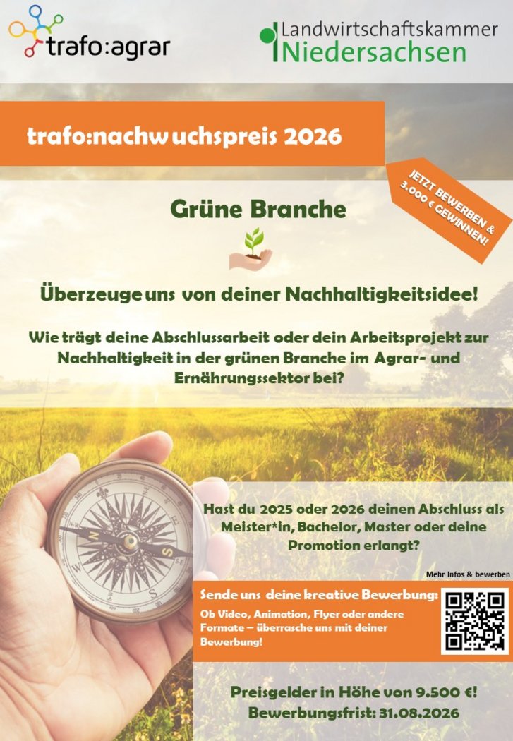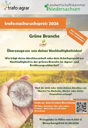 Der trafo:nachwuchspreis wurde ins Leben gerufen, um innovative Konzepte, Technologien, Produkte und Lösungen für Betriebe, Bildung und Praxis auszuzeichnen, die zu einer nachhaltigkeitsorientierten Transformation der Agrar- und Ernährungswirtschaft beitragen.