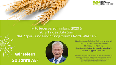 Das AEF feiert 20-jähriges Jubiläum! Einladung zur AEF-Mitgliederversammlung und Jubiläumsveranstaltung am Mittwoch, 29. April 2026 um 15:30 Uhr (Einlass ab 15:00 Uhr) bei dem Unternehmen MIAVIT GmbH, Robert-Bosch-Straße in 49632 Essen/Oldb. Im Anschluss an den offiziellen Teil als Gastredner wird Herr Alois Rainer, Bundesminister für Landwirtschaft, Ernährung und Heimat, begrüßt.