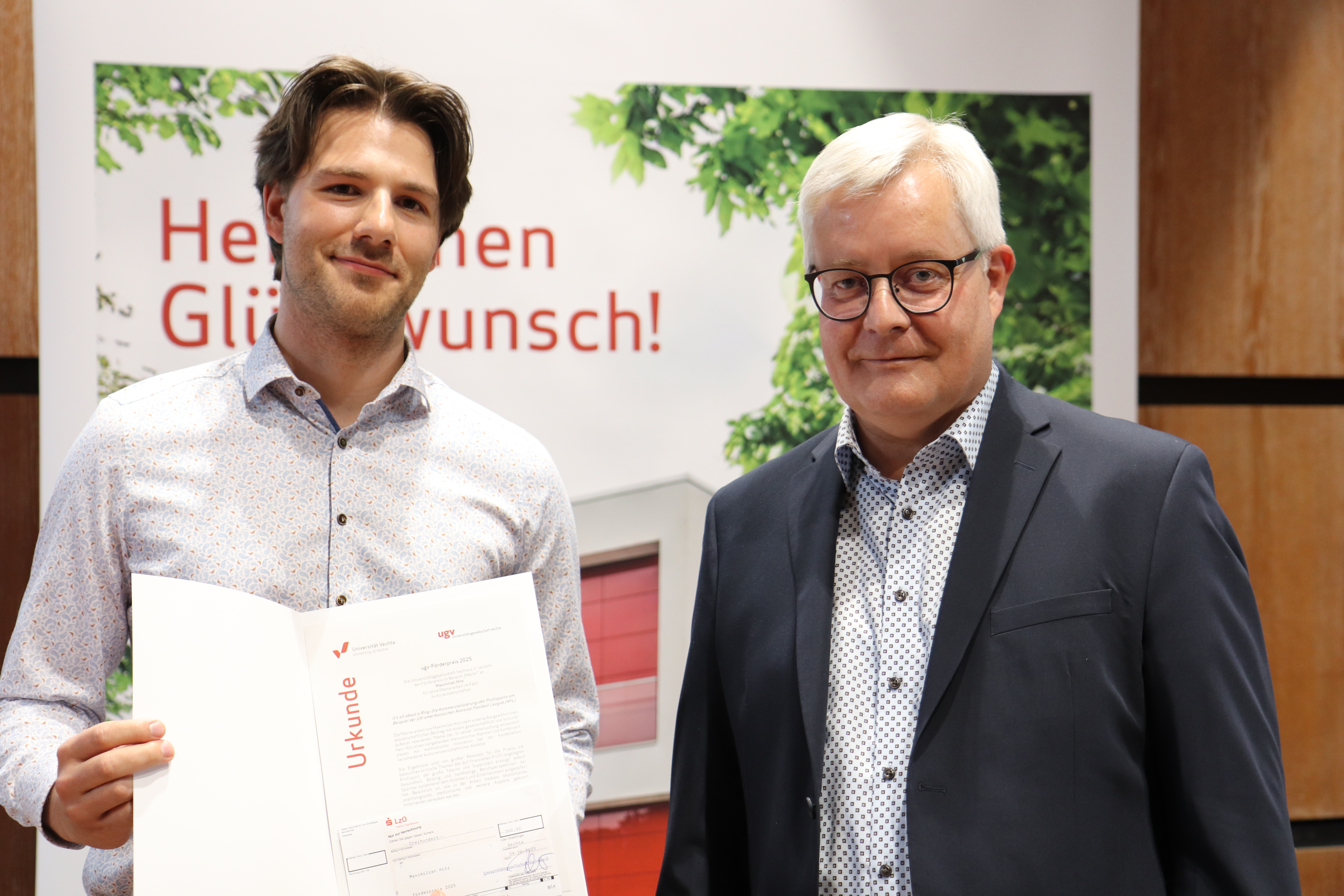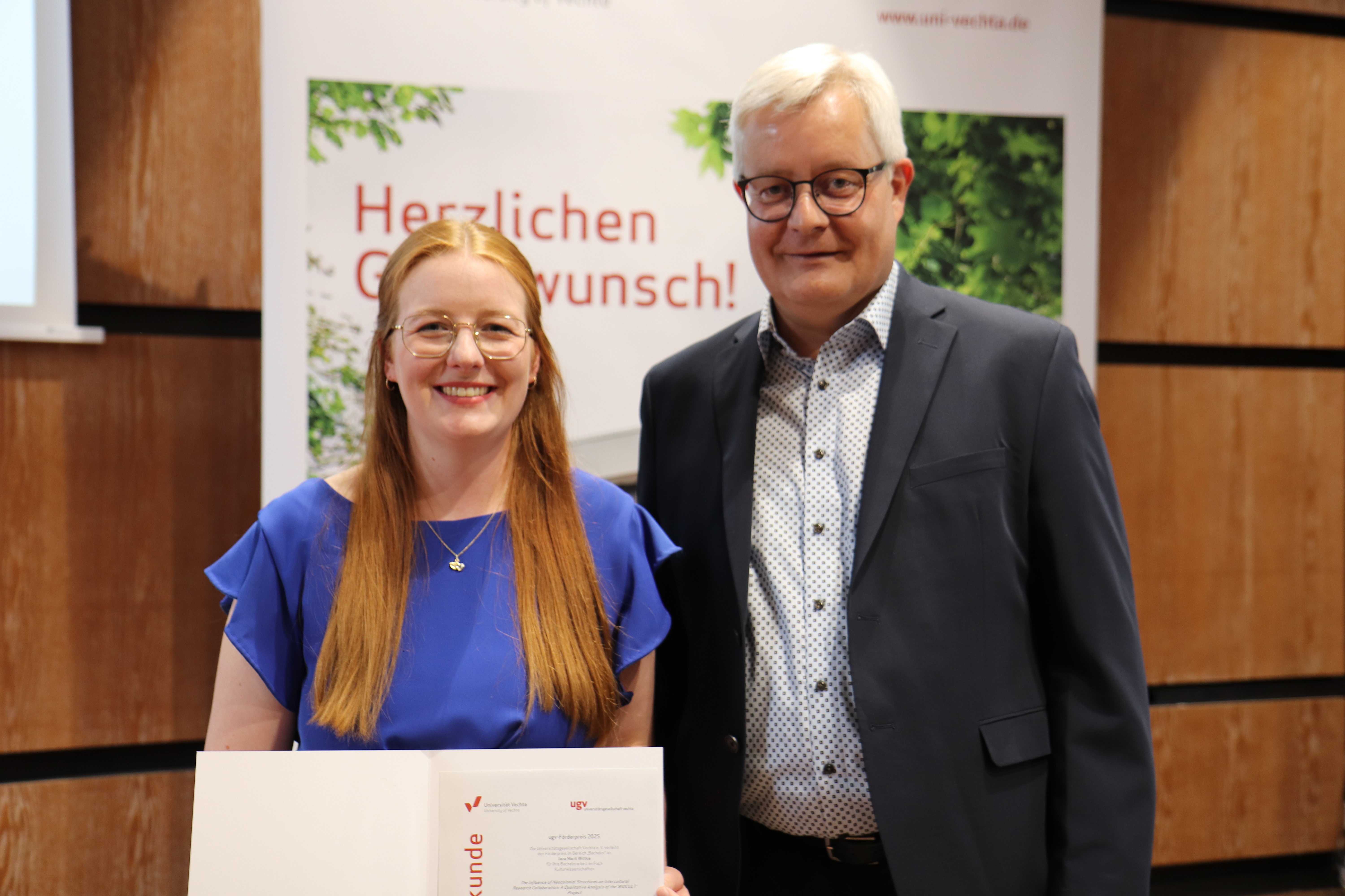 Direkt zwei Abschlussarbeiten aus den kulturwissenschaftlichen Studiengängen aus dem Jahr 2024 konnten das Auswahlgremium der Universitätsgesellschaft Vechta (UGV) überzeugen: Sowohl die Bachelor-Arbeit von Jana Marit Wittke B.A. als auch die Master-Arbeit von Maximilian Hitz M.A. wurden mit den UGV-Förderpreisen für besonders herausragende Leistungen ausgezeichnet.