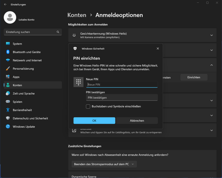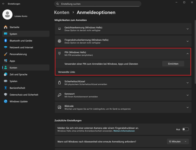 Für Windows Hello stehen mehrer Möglichkeiten der Anmeldung zur Verfügung, in diesem Beispiel wird ein PIN für Windows Hello verwendet.