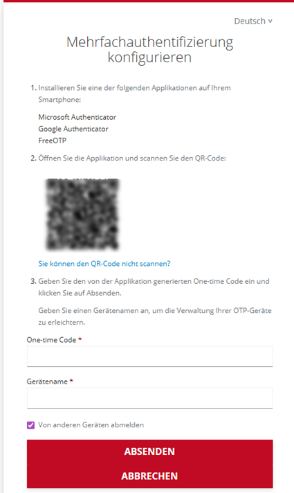 Jetzt müssen Sie den erzeugten Token noch verifizieren. Geben Sie dazu den in der App generierten Code auf der MFA-Website ein und Suchen sich sich einen Gerätenamen aus. Zum Beispiel Smartphone, IPhone etc. Zum Schluss wählen Sie "Absenden".