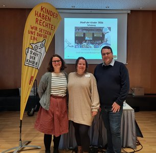 Das Foto zeigt Michael Otten mit den Organisatorinnen des Kinderbüros, Barbara Scharf und Daniela Krenzer. Nicht im Bild ist Clara Riecke.