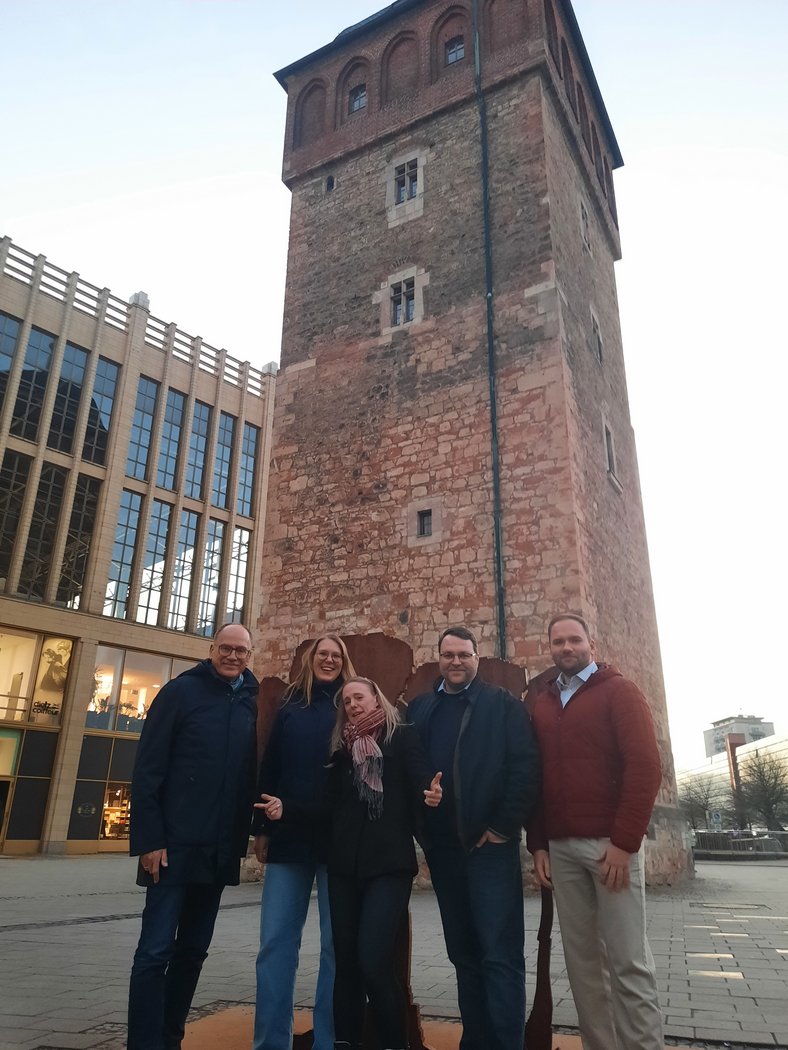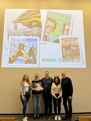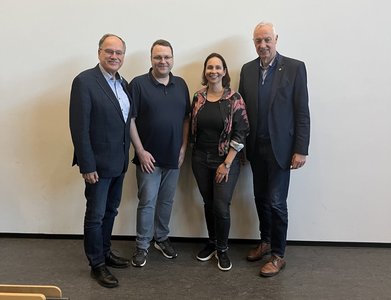 Das Foto zeigt (von rechts): Tabea Neumann (Studentin im Master, Organisationsteam), Prof.in Dr.in Andrea Becher, Michael Otten, Lena Sommer (Kulturbeauftragte des Fachrates) und Prof. Dr. Steffen Wittkowske.