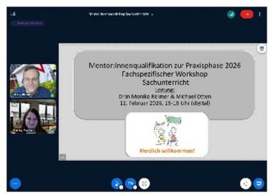 Seit einigen Wochen absolvieren die Studierenden im Masterstudiengang ihren Praxisblock in den Schulen. Über einen Zeitraum von 18 Wochen erhalten sie die Möglichkeit, im Unterricht zu hospitieren, eigene Unterrichtsvorhaben durchzuführen und Schule auch über den Unterricht hinaus in ihren organisatorischen und pädagogischen Strukturen kennenzulernen. Bei diesen Aufgaben werden die Studierenden an den Schulen durch Mentor:innen begleitet. Zur Unterstützung dieser verantwortungsvollen Aufgabe boten Dr.in Monika Reimer und Michael Otten am 12. Februar 2026 eine dreistündige digitale Mentor:innenschulung an. Rund 15 Mentor:innen nahmen an der Veranstaltung teil und nutzten die Gelegenheit zum fachlichen Austausch sowie zur Klärung zentraler Fragen der Begleitung in der Praxisphase.