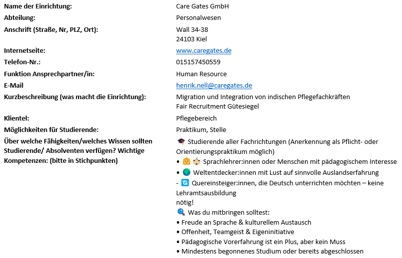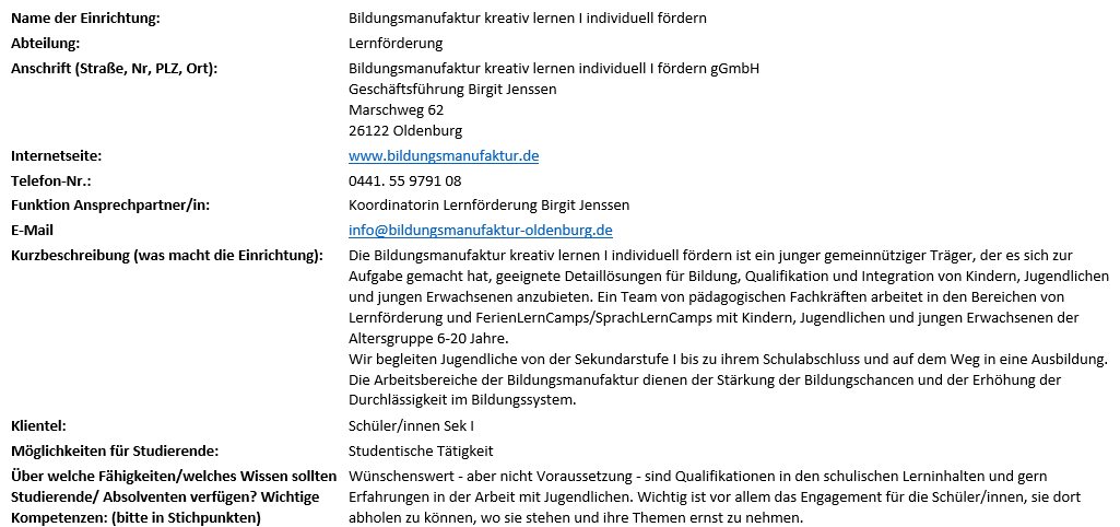 Das soll als Nebenjob gedacht werden, neben dem Studium, damit die Studenten Erfahrung sammeln können und auch natürlich etwas Geld verdienen können.Meine Mail Adresse lautet : info@inlingua-oldenburg.de