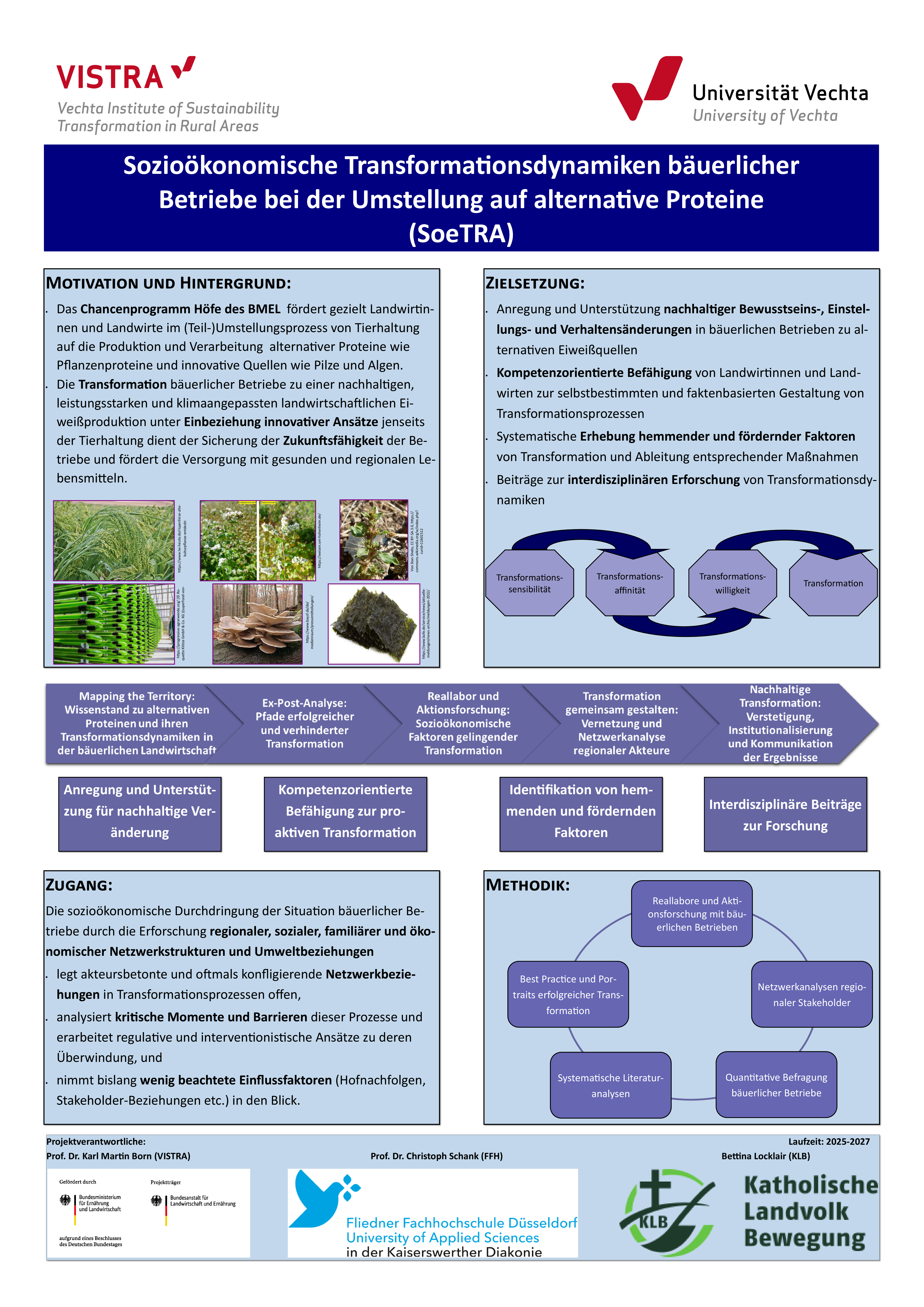 Wie umfassend und facettenreich Transformationen als Wandlungsprozesse in Politik, Wirtschaft, Gesellschaft, Wissenschaft, Bildung, Kultur und Umwelt tatsächlich sind, verdeutlicht das Projekt SoeTRA (Sozioökonomische Transformationsdynamiken bäuerlicher Betriebe bei der Umstellung auf alternative Proteine). Hier soll die Forschung sowohl nachhaltige Bewusstseins-, Einstellungs- und Verhaltensänderungen bei Landwirten anregen, als auch die notwendigen Kompetenzen vermitteln, daraus betriebliches Handeln abzuleiten, sowie systemisch hemmende und fördernde Faktoren identifizieren und entsprechende Maßnahmen ableiten.