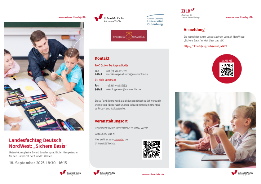 Der Landesfachtag Deutsch NordWest: Sichere Basis ist eine Gemeinschaftsveranstaltung der Universitäten Oldenburg, Osnabrück und Vechta und richtet sich an Lehrkräfte und pädagogische Mitarbeitende und in der Regionalabteilung Osnabrück. Die Fortbildung wird als bildungspolitisches Schwerpunktthema vom Niedersächsischen Kulturministerium finanziell gefördert und ist kostenfrei.